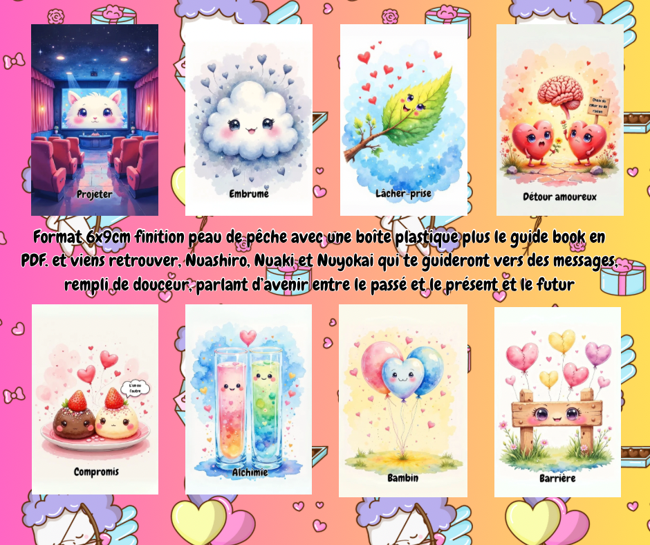 - **Le Cœur dans les Nuages** : **44 cartes** qui t’aident à comprendre tes émotions et à explorer ton chemin sentimental, guidé par la tendre **Nuaki**.